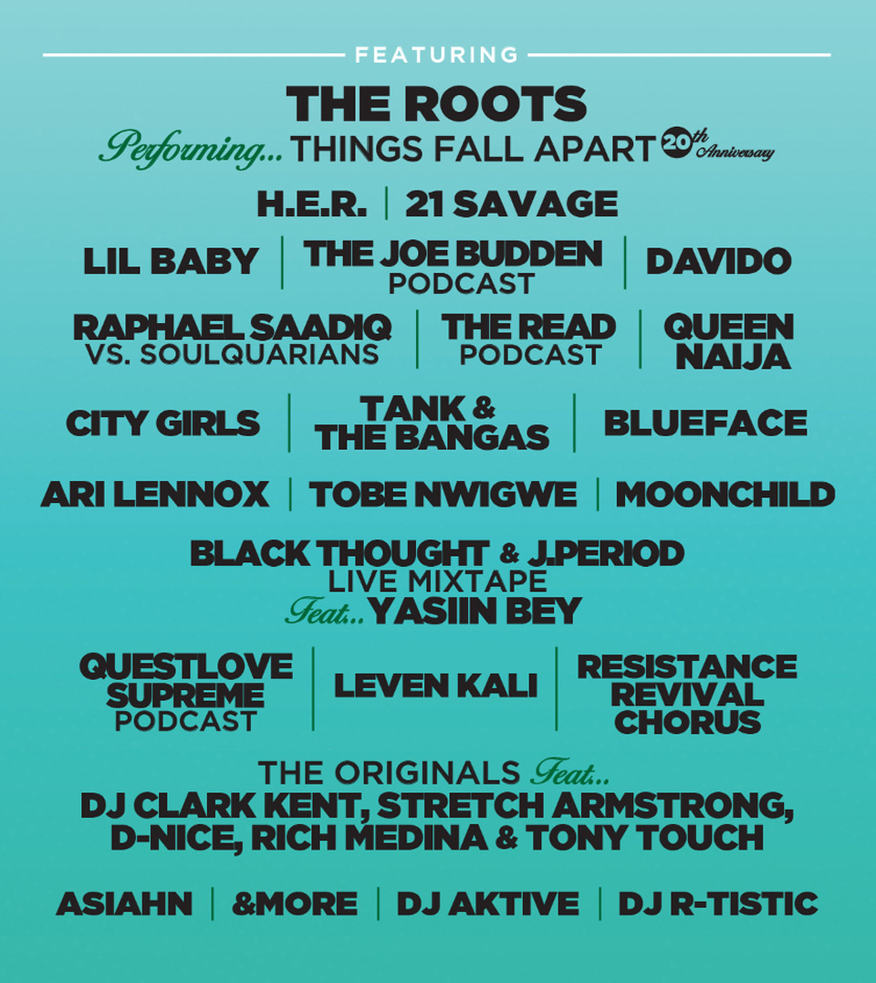 The 2019 Roots Picnic lineup is out and features The Roots performing Things Fall Apart in full, also in the list are H.E.R., 21 Savage, Lil Baby, The Joe Budden Podcast, Dvido and more! See the lineup poster farther down below for a complete listing.